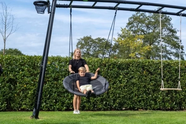 Verrijk je GetSet speeltoestel met deze nestschommel! Deze royale schommel biedt volop ruimte om heerlijk te schommelen, ontspannen of samen te genieten. Dankzij het stevige metalen frame en de bekleding van duurzame, weersbestendige materialen is de nestschommel geschikt voor buitengebruik. De sterke polyester touwen zijn verstelbaar tussen 122 en 180 cm, zodat je de schommel perfect kunt afstemmen op de gewenste hoogte. Met een diameter van Ø100 cm biedt hij veel zit- en ligruimte. De maximale draagkracht bedraagt 100 kg. De nestschommel is binnen enkele seconden stevig en veilig te bevestigen aan een GetSet monkeybarframe.