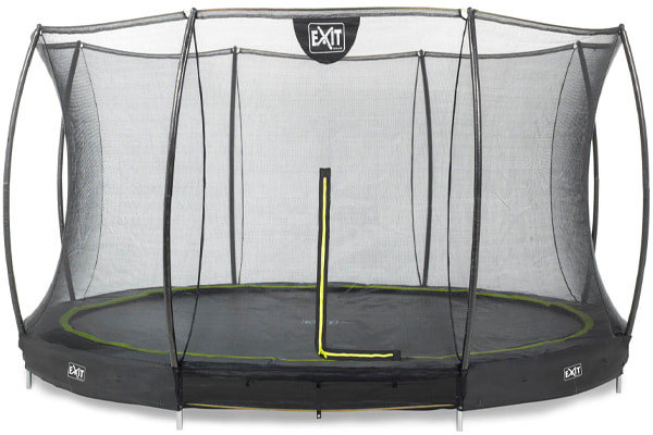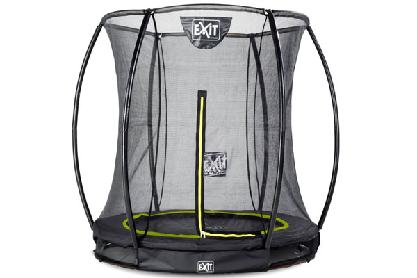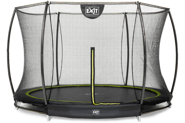 Een trampoline om in te graven: de Silhouette inground 244. Deze trampoline van EXIT heeft een solide stalen frame, afgewerkt met een poedercoating. Deze houdt het 164 cm hoge veiligheidsnet omhoog. Rondom zit een zwarte beschermrand van 28,5 cm breed. Het springoppervlak is 187 cm in diameter en wordt op zijn plek gehouden door 42 dubbel conische veren. De trampoline kan maximaal 50 kg dragen.