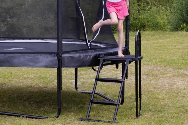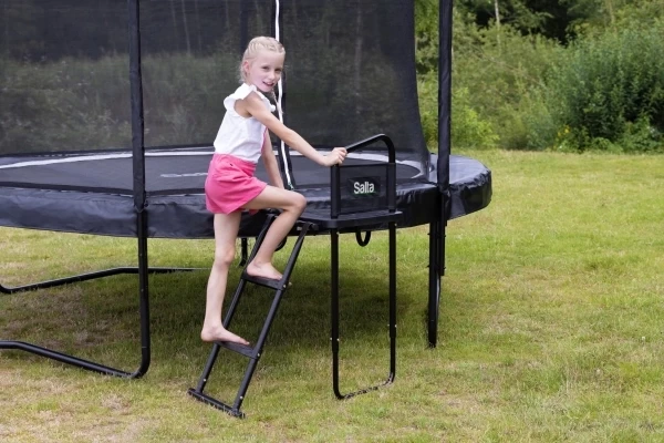 Met het Salta Platform stap je veilig en comfortabel op je trampoline. Dit stevige opstapplatform is in hoogte verstelbaar van 58 tot 108 cm en wordt inclusief trapje maat M geleverd. Dit maakt de set geschikt voor elk trampolineframe met een hoogte van 65 tot 77 cm. Het biedt directe ondersteuning bij het beklimmen door de stabiele stalen leuning en kan in combinatie met iedere ladder gebruikt worden. Het ruime plateau geeft voldoende plek voor beide voeten, zodat je eenvoudig door het veiligheidsnet stapt. Dankzij het antislip-profiel sta je ook met sokken of blote voeten stevig en veilig, terwijl regenwater door de slimme afwatering niet blijft liggen. Het platform is gemaakt van duurzaam polypropyleen en kan tot 180 kg dragen.