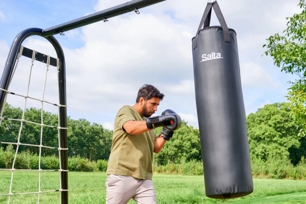 Verrijk je PlayFit speeltoestel met deze bokszak! Deze bokszak weegt 25 kg en is gevuld met een mix van fijn gebroken zand, textielvezels en EPE-foam. En hij is voorzien van 0,5 mm versterkt PVC. Hierdoor absorbeert hij stoten perfect en behoudt hij altijd zijn vorm. De bokszak is 120 cm lang en hangt veilig en stabiel aan vier stevige polyester banden. Dankzij de roestvrijstalen karabijn is de bokszak binnen enkele seconden stevig en veilig aan een PlayFit schommel- of monkeybarframe te bevestigen. Voer een full-body workout uit, direct in de achtertuin.