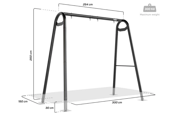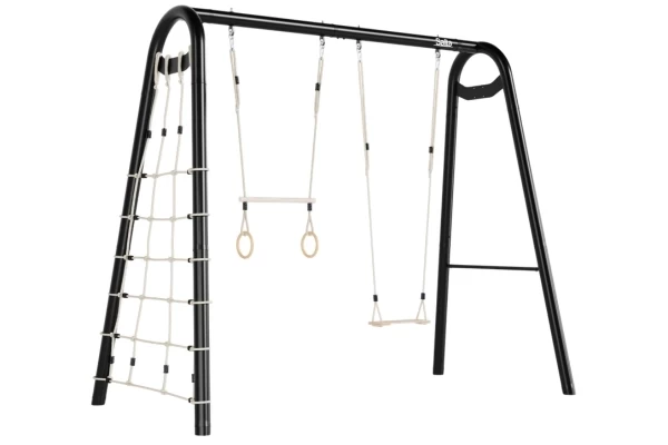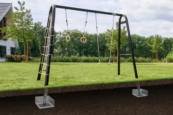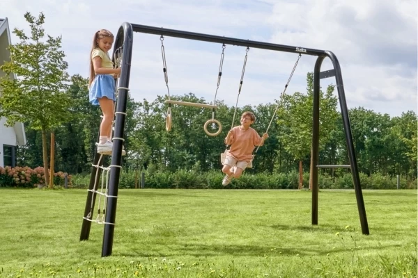 Maak van je tuin dé plek voor beweging, spel en avontuur met de Salta PlayFit Schommel (300x150x250 cm). Dit veelzijdige alles-in-één speel- en sportframe pas je volledig aan naar de wensen van jouw gezin! Het robuuste frame is van gegalvaniseerd staal met een zwarte poedercoating. Roestvrijstalen bevestigingen en duurzame materialen maken het frame weerbestendig en onderhoudsarm. Het ophangsysteem maakt het wisselen van accessoires moeiteloos. Deze set bevat een duikelrek, schommel, trapeze met ringen en een klimnet. Het Polyhemp-touw van alle accessoires is zacht voor de handen, vuilafstotend en weerbestendig. Om het speeltoestel te installeren moeten de zelfstabiliserende poten stevig verankerd worden in snelbeton (niet inbegrepen).