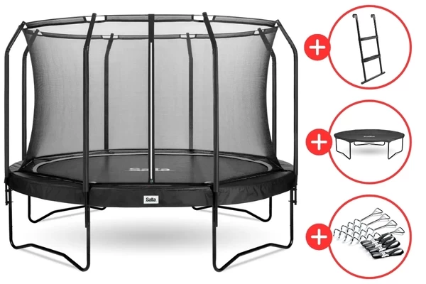 Inclusief trapje, verankeringsset en afdekhoes! De Premium Black 366 trampoline van het merk Salta kan maximaal maar liefst 150 kilo dragen. Veilig springen kan dankzij het hoge veiligheidsnet en de dikke beschermrand. De springmat is van hoge kwaliteit en wordt ondersteun door 64 veren van 16,5 cm. Het frame is stabiel en van gegalvaniseerd staal. Deze design trampoline heeft een diameter van 366 cm en staat garant voor uren springplezier.