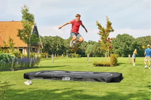 De Salta Premium Ground Sports is een ingraaftrampoline die perfect opgaat in elke tuin dankzij het strakke en moderne ontwerp. Doordat de trampoline slechts 21,5 cm boven de grond uitsteekt, is de op- en afstap laag en veilig. De rechthoekige trampoline is 305x214 cm en vervaardigd uit duurzame materialen van hoge kwaliteit. Het frame is robuust uitgevoerd en volledig gegalvaniseerd, zowel aan de binnen- als buitenzijde. De veiligheidsrand is voorzien van een geïntegreerd luchtstroomsysteem, waardoor lucht onder de springmat optimaal kan circuleren. In combinatie met de lage 185 mm veren zorgt dit voor een soepele en krachtige sprong! De extra dikke PVC beschermrand biedt kan met de meegeleverde verankeringsset stevig aan de grond worden bevestigd.