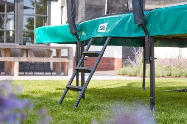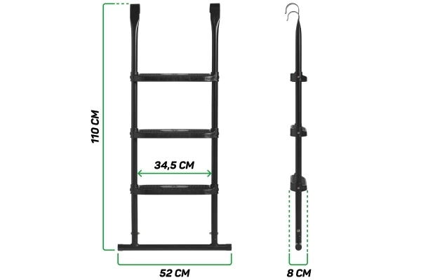 Klim makkelijk de trampoline op met deze ladder! Deze maat L heeft een afmeting van 110x52 cm en heeft drie anti-slip treden. Het trapje is geschikt voor alle trampolines waarvan het frame een hoogte heeft van 94 tot 110 cm. Dankzij de twee haken is het trapje makkelijk te bevestigen aan de trampoline. De ladder is van gegalvaniseerd staal en heeft een zwarte poedercoating.